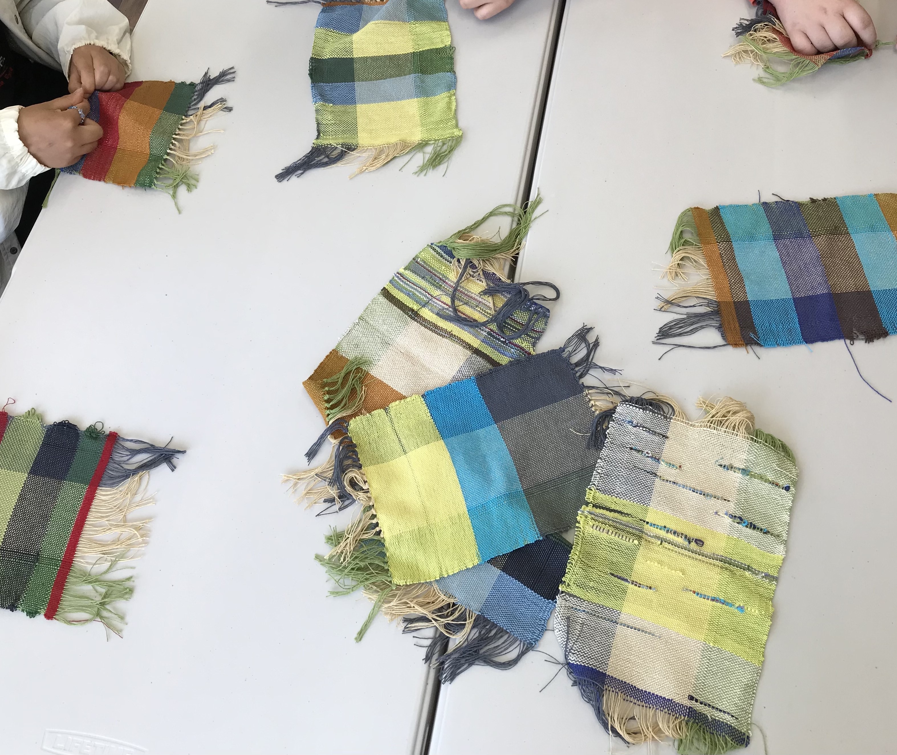 5月17日の月いちマルシェで、販売するはた織りの敷物を皆で織りました。